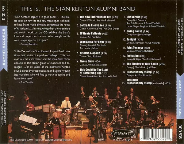 Stan Kenton Alumni Band: Have Band Will Travel - Live verzia na CD v štandardný edícii. Toto konkrétne vydanie vyšlo v USA vo vydavateľstve Summit Records (3) dňa 9. februára 2015. Album zasahuje do žánrov Jazz a Big Band.