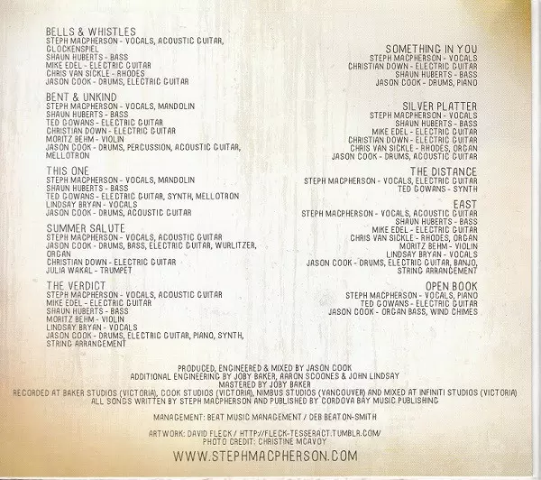 Bass Shaun Huberts | Drums, Electric Guitar Jason Cook (10) | Electric Guitar Mike Edel | Electric Piano [Rhodes] Chris Van Sickle | Vocals, Acoustic Guitar, Glockenspiel Steph Macpherson