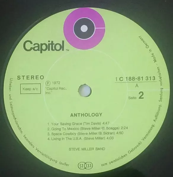 Steve Miller Band: Anthology verzia na vinylu 2LP v štandardný edícii. Toto konkrétne vydanie vyšlo v Německu vo vydavateľstve Capitol Records roka 1972. Album zasahuje do žánrov Rock, Pop Rock a Classic Rock. Gatefold & Green Label Vinyl.