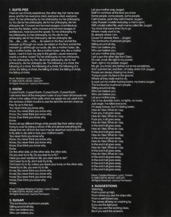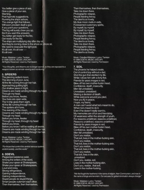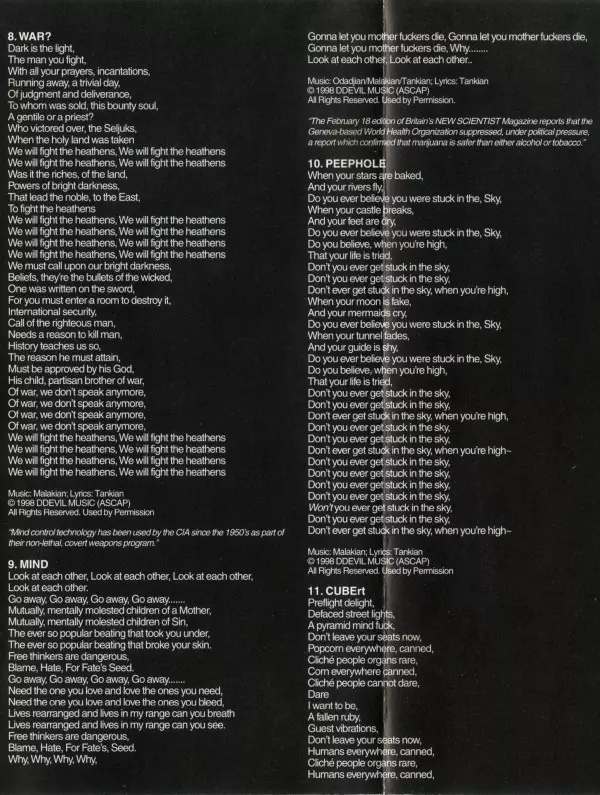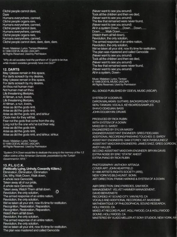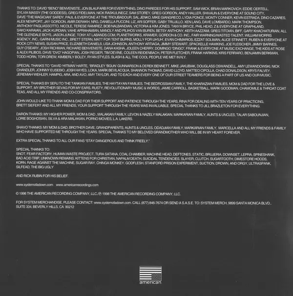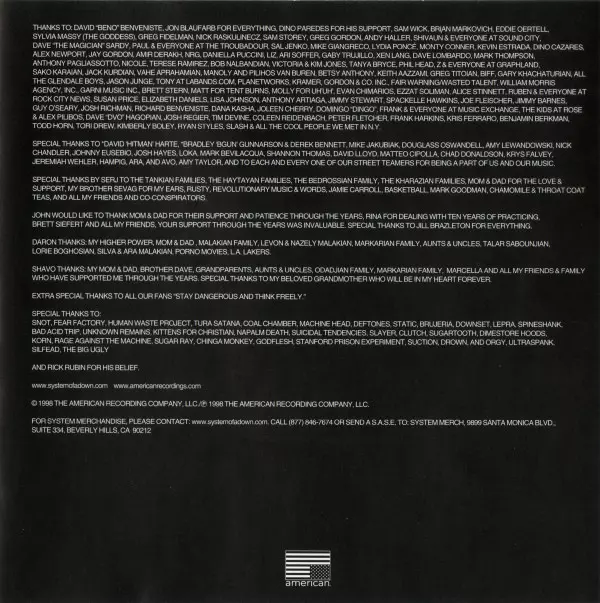 Kvarteto System Of A Down, ktoré produkovala legenda mixážneho pultu Rick Rubin, debutovalo v roku 1998 skutočne senzačne. Svojím gothic metalovým majstrovským dielom vytvorili jedno zo zásadných diel tohto žánru. Brutálne riffy, strhujúce texty a úderné rytmy nenechajú poslucháča vydýchnuť. Tí, ktorí vydržali dlhé hranie, sú pripravení na ďalši...