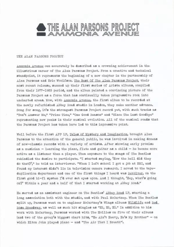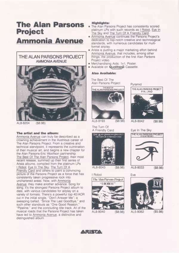 "Ammonia Avenue" was the seventh album by The Alan Parsons Project, released in February 1984. Composer, musician and manager Eric Woolfson and acclaimed producer and engineer Alan Parsons were behind the project. Musicians such as Ian Bairnson (guitars), David Paton (bass) and Stuart Elliott (drums) contributed to the album, with Eric Woolfson ...