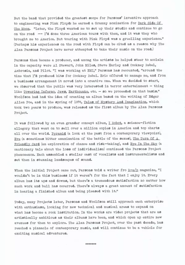 The Alan Parsons Project bola britská progresívna rocková skupina, ktorú v roku 1975 založili zvukový inžinier a hudobný producent Alan Parsons a skladateľ, hudobník a manažér Eric Woolfson. Skupina bola známa svojimi koncepčnými albumami, na ktorých sa namiesto stálej zostavy kape...