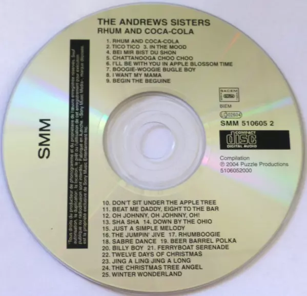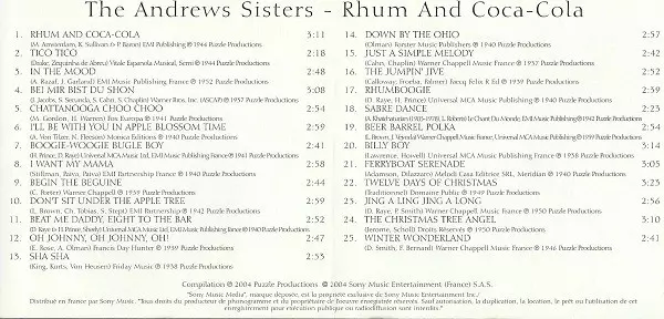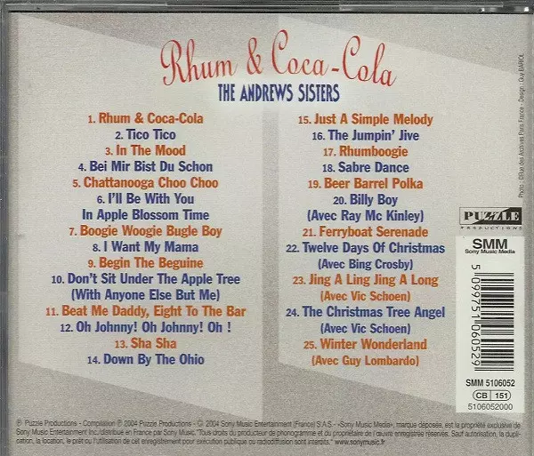 The Andrews Sisters: Rhum & Coca-Cola verzia na CD v štandardný edícii. Toto konkrétne vydanie vyšlo v Francii vo vydavateľstve Puzzle Productions v spolupráci s Sony Music Media dňa 7. decembra 2004. Album zasahuje do žánrov Pop, Jazz, Vokál a Swing.