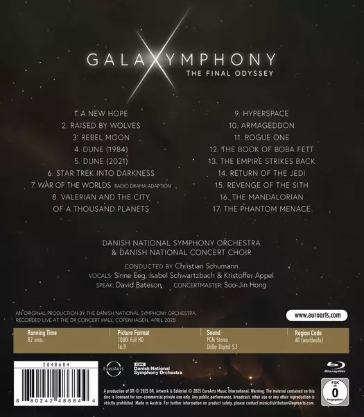 DR SymfoniOrkestret: Galaxymphony (The Final Odyssey) verzia na Blu-ray v štandardný edícii. Toto konkrétne vydanie vyšlo v Dánsku vo vydavateľstve EuroArts dňa 19. decembra 2025. Album zasahuje do žánrov Stage & Screen a Soundtrack.