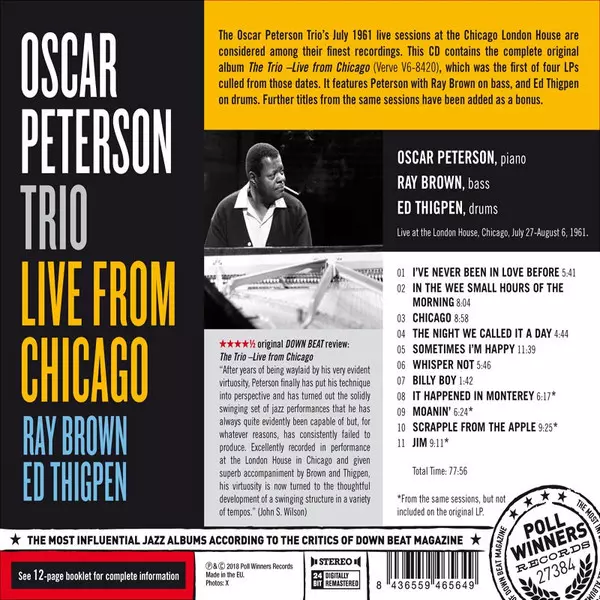 The Oscar Peterson Trio: The Trio : Live From Chicago from 1961 is an album that was recorded live at the Sutherland Lounge in Chicago, Illinois. The album features Oscar Peterson on piano, Ray Brown on bass and Herb Ellis on guitar. The album was released in 1961 by Verve Records.