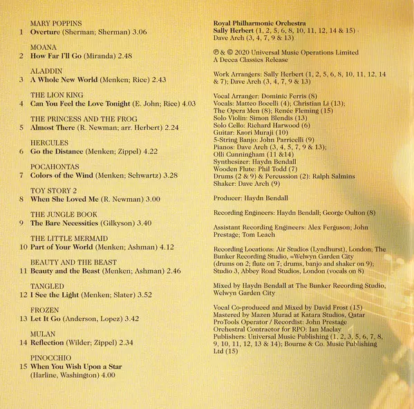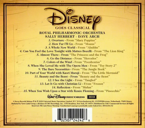 Decca Records and Disney are releasing a special Disney Goes Classical album featuring a variety of Disney's most beautiful songs set to symphony orchestra music. Featuring first-class recordings from the legendary Abbey Road studios with classics such as "Can You Feel the Love Tonight" (The Lion King), "The Bare Necessities" (The Jungle Book), ...