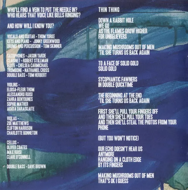 Bass Jonny Greenwood | Cello [Cellos] Clare O'Connell, Max Ruisi, Oliver Coates | Double Bass Dave Brown (37), Tom Herbert | Drums Tom Skinner | Piano Thom Yorke | Viola [Violas] Charlotte Bonneton, Clifton Harrison, Zoe Matthews | Violin [Violins] Agata Daraškaitė, Alessandro Ruisi, Eloisa-Fleur Thom, Sophie Mather, Zara Benyounes