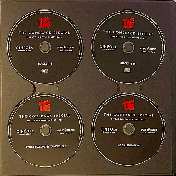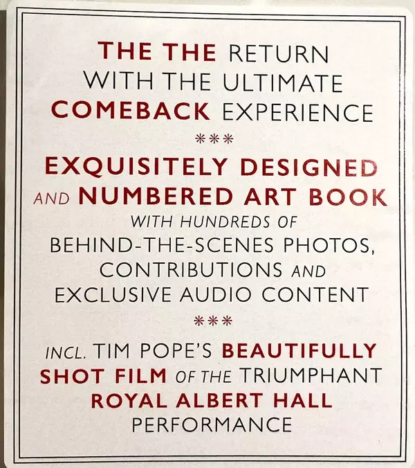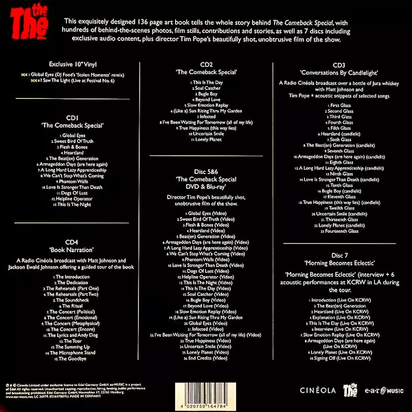 The The: The Comeback Special (Live At The Royal Albert Hall) DLX | LTD | NUM verzia na vinylu 5CD/DVD/Box Set/Blu-ray/EP v 45 RPM deluxe limitované individuálne číslované edícii. Toto konkrétne vydanie vyšlo v Evropě vo vydavateľstve Cinéola v spolupráci s Ear Music dňa 29. októbra 2021. Album zasahuje do žánrov Rock a Indie Rock. Numbered Limited Boxset Multichannel Pcm 2.0 Dts Hd Ma 5.1 Art Book Deluxe Edition.