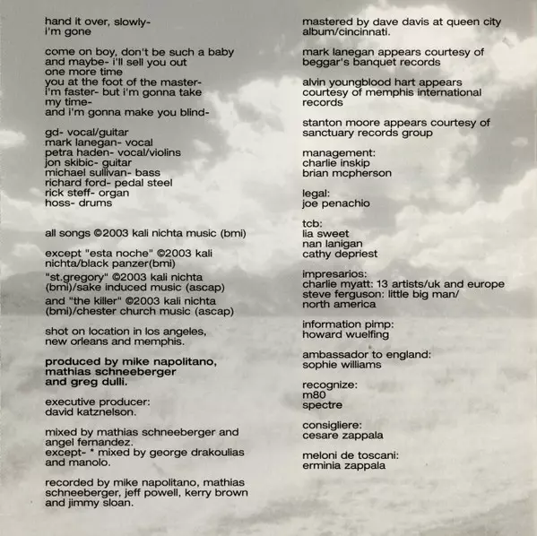 Bass Michael Sullivan (5) | Drums Hoss (6) | E-Bow Jesse Tobias | Mixed By George Drakoulias, Manolo (9) | Vocals Apollonia, Petra Haden, Steve Myers (4) | Vocals, Guitar, Piano Greg Dulli | Written-By Greg Dulli