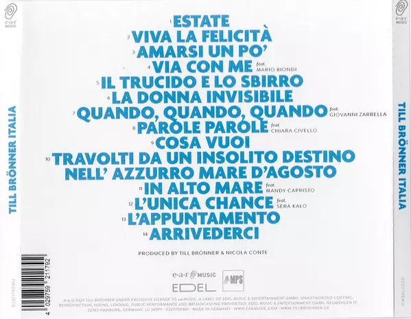 Till Brönner: Italia verzia na CD v štandardný edícii. Toto konkrétne vydanie vyšlo v Německu vo vydavateľstve Ear Music dňa 5. septembra 2025. Album zasahuje do žánrov Pop, Jazz, Easy listening a Smooth Jazz.