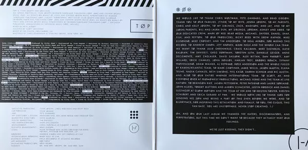 Drums, Vocals Josh Dun | Engineer Adam Hawkins | Engineer [Assistant] Brent Arrowood | Guitar, Bass, Programmed By, Keyboards, Vocals Mike Elizondo | Piano, Vocals Tyler Joseph | Producer Mike Elizondo | Tenor Saxophone, Alto Saxophone, Baritone Saxophone, Flute David Moyer | Trumpet, Trombone, Euphonium Danny T. Levin