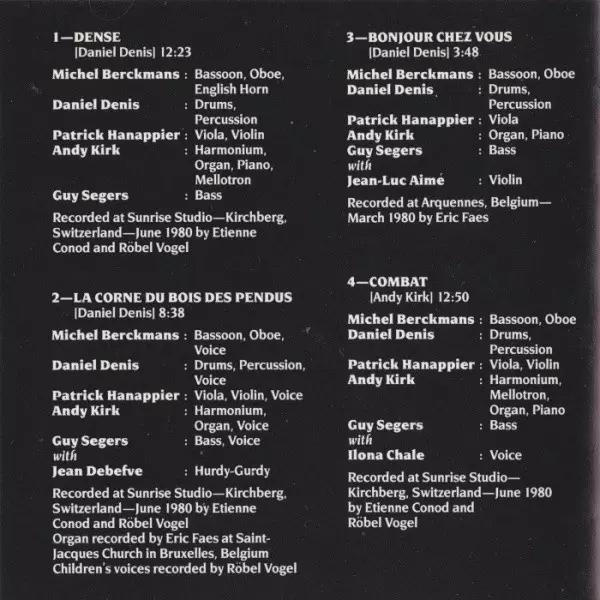 Bass, Voice Guy Segers | Bassoon, Oboe, Voice Michel Berckmans | Drums, Percussion, Voice Daniel Denis | Guest [With], Hurdy Gurdy [Hurdy-Gurdy] Jean Debefve | Harmonium, Organ, Voice Andy Kirk (2) | Recorded By [Children's Voices Recorded By] Robert Vogel | Recorded By [Organ Recorded By] Eric Faes | Viola, Violin, Voice Patrick Hanappier | Written-By Daniel Denis