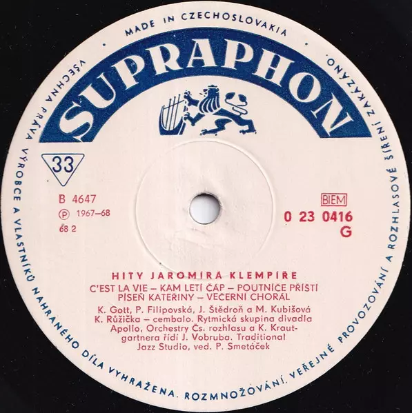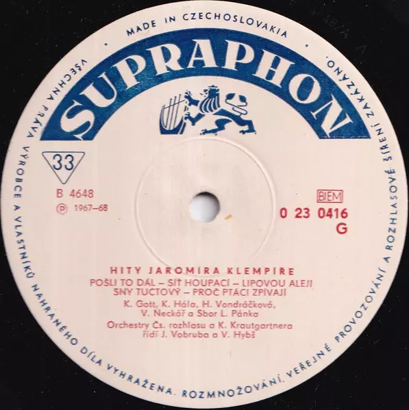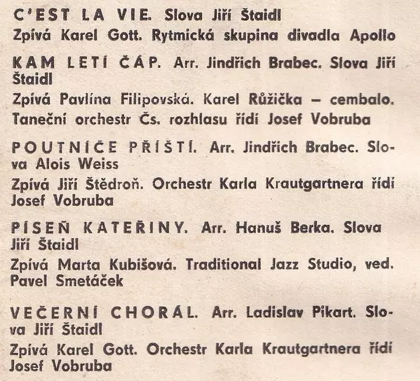 Arranged By Ladislav Pikart | Conductor [Řídí] Josef Vobruba | Lyrics By Jiří Štaidl | Orchestra Orchestr Karla Krautgartnera (2) | |||