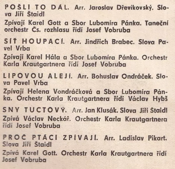 Arranged By Ladislav Pikart | Conductor [Řídí] Josef Vobruba | Lyrics By Jiří Štaidl | Orchestra Orchestr Karla Krautgartnera (2) |