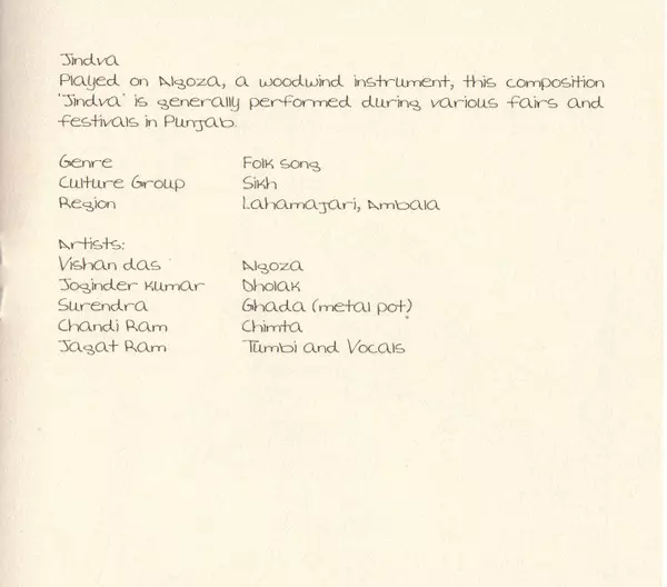 | Algoza Vishan Das | Dholak Joginder Kumar | Instruments [Chimta] Chandi Ram | Instruments [Ghada (Metal Pot)] Surendra (2) | Instruments [Tumbi], Vocals Jagat Ram Lalka | |||
