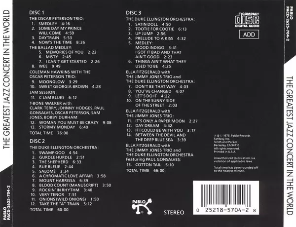 | 1-12 | Oscar Peterson, Johnny Hodges, Clark Terry, T-Bone Walker, Sam Jones, Paul Gonsalves, Bobby Durham: Woman You Must Be Crazy | 9:10 min | |
