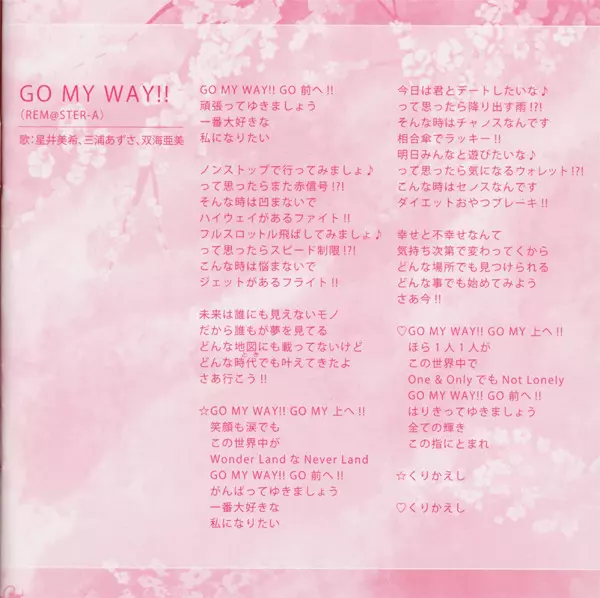 | 2 | Asami Shimoda, Akiko Hasegawa, Chiaki Takahashi: Go My Way!! (Rem@Ster-A) | 4:17 min | |