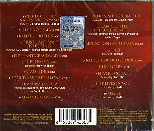 Various: The Lion King (Original Motion Picture Soundtrack) verzia na CD v štandardný edícii. Toto konkrétne vydanie vyšlo v Evropě vo vydavateľstve Walt Disney Records dňa 19. júla 2019.