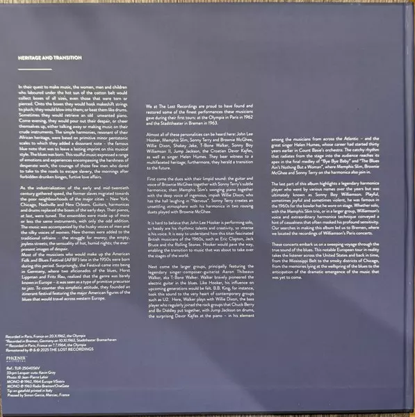 Various: The Original American Folk Blues Festival (Live In Paris 1962 • Bremen 1963) NUM | LTD verzia na vinylu 2LP v individuálne číslované remasterované limitované edícii. Toto konkrétne vydanie vyšlo v Francii vo vydavateľstve The Lost Recordings dňa 31. januára 2025. Album zasahuje do žánrov Blues, Chicago Blues a Delta Blues.