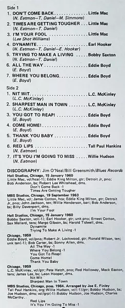 | Bass Margo Gibson | Drums Harold Tidwell | Guitar Earl Hooker | Saxophone Ernest Cotton | Vocals Bobby Saxton | Written-By Earl Hooker, Narvel Eatmon, Ted Daniels | |||