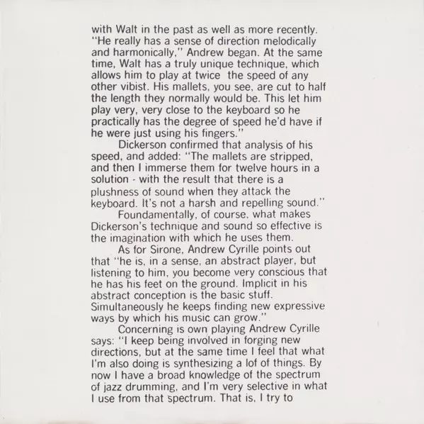 | Interpret | Andrew Cyrille | Walt Dickerson | Sirone |