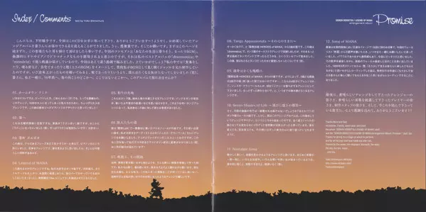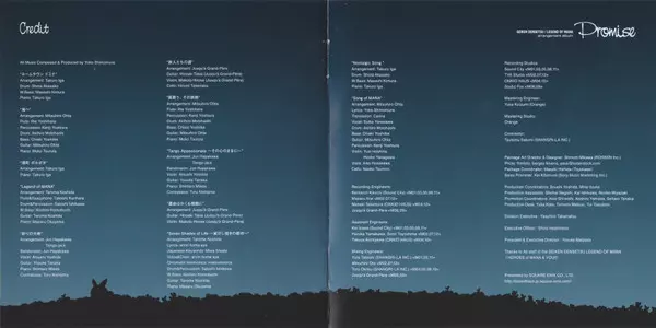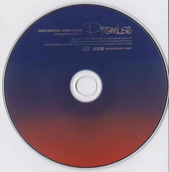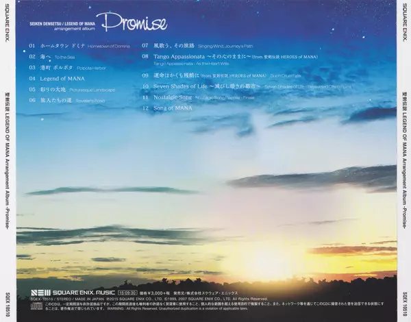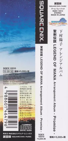 Yoko Shimomura: Seiken Densetsu / Legend Of Mana Arrangement Album Promise = 聖剣伝説 Legend Of Mana Arrangement Album - Promise - verzia na CD v štandardný edícii. Toto konkrétne vydanie vyšlo v Japonsku vo vydavateľstve Square Enix Music dňa 30. septembra 2015. Album zasahuje do žánrov Stage & Screen, Soundtrack a Hudba k videohrám.