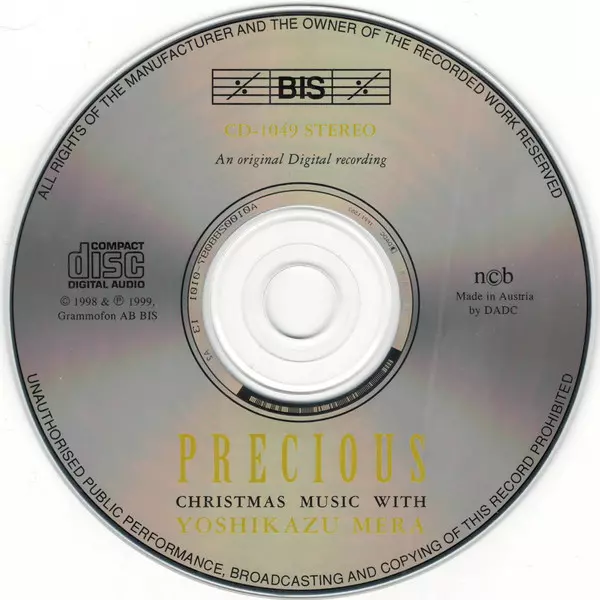 Yoshikazu Mera: Precious (Christmas Music With Yoshikazu Mera) verzia na CD v štandardný edícii. Toto konkrétne vydanie vyšlo v Švédsko vo vydavateľstve BIS dňa 1. októbra 1999. Album možno zaradiť do žánru Klasická hudba.