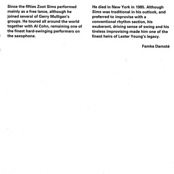 Zoot Sims bol americký jazzový saxofonista, známy svojím swingujúcim štýlom a bohatým tenorovým zvukom. Narodil sa ako John Haley Sims 29. októbra 1925 v Inglewoode v Kalifornii a stal sa jednou z vedúcich osobností hnutia cool jazz. Sims bol členom skupiny Woodyho Hermana Second H...